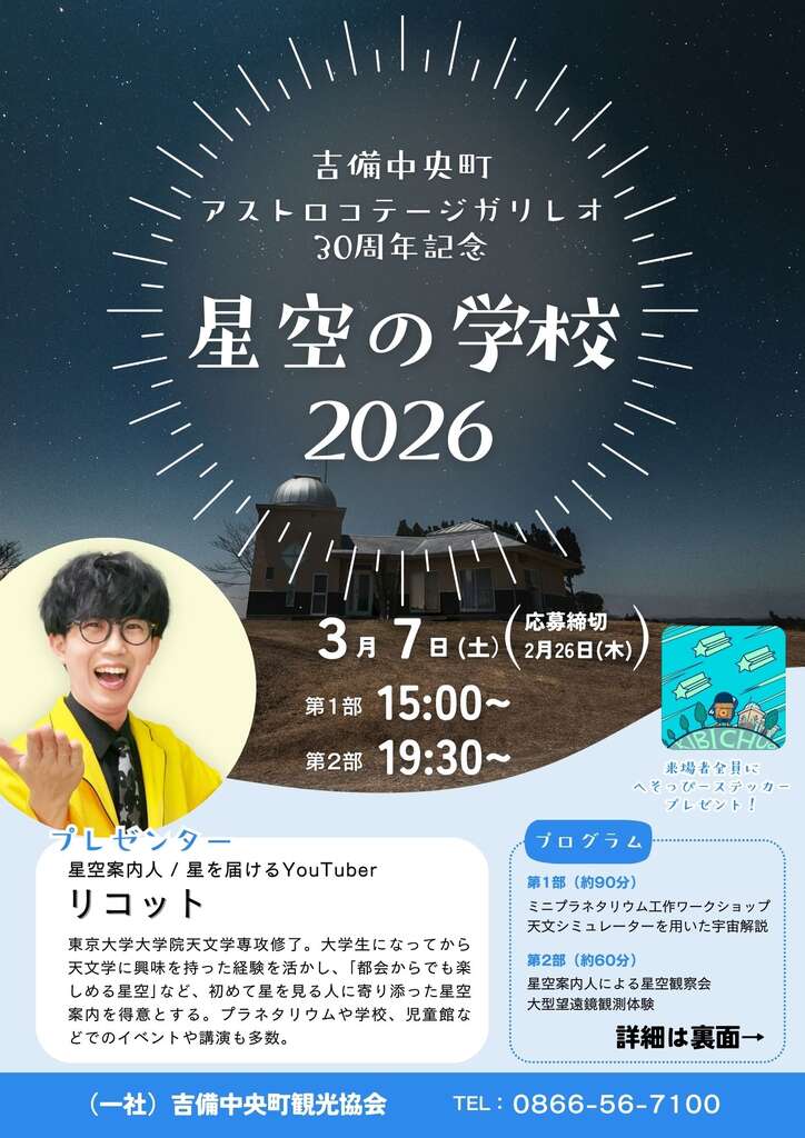 「アストロコテージ30周年記念 星空の学校2026」を開催します。 「星空の学校2025」からさらにボリュームアップして昼と夜の2部制で開催。 イベントのプレゼンターとして星空案内人/星を届けるYouTuber リコット […]